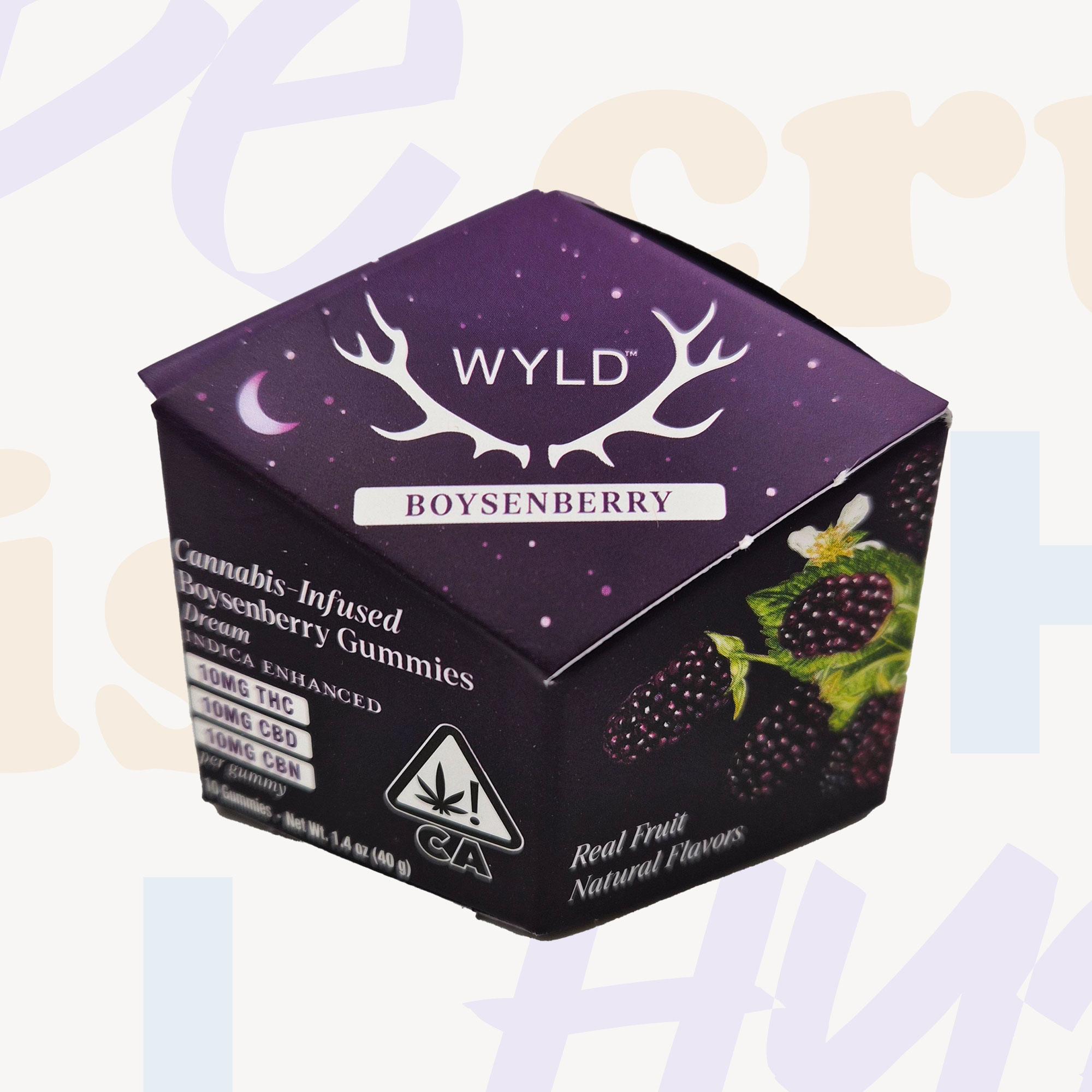 1. Boysenberry (Indica) – 10mg THC, 10mg CBD and 10mg CBN per gummy, 10 gummies per pack for a total of 100mg THC/CBD/CBN.